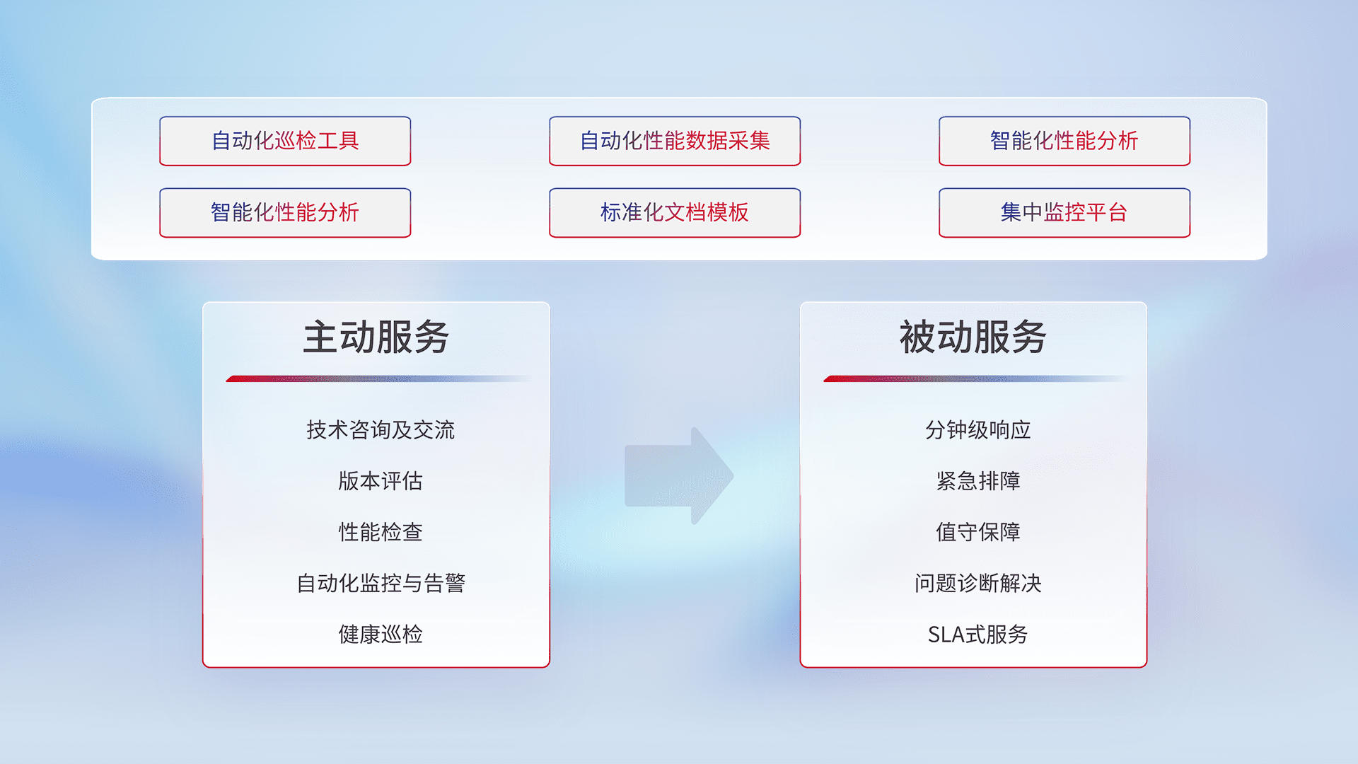 智能化工具和标准化文档,,,,保障服务质量,,,提供主动服务(包含技术咨询、、版本评估、、、、性能检查、、自动化监控与告警、、、、健康巡检)和被动服务包含(分钟级响应、、紧急排障、、、、值守保障、、、问题诊断解决、、、、SLA服务)。。